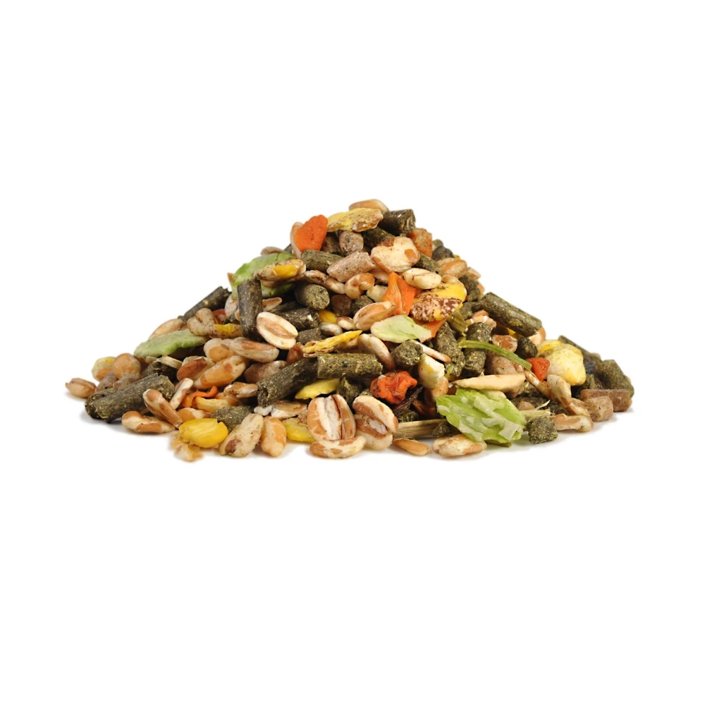 Состав: травяные гранулы, плоды рожкового дерева (кэроб), пшеница воздушная, кукуруза воздушная, ячмень воздушный, горох плющеный, хлопья кукурузные, морковь сушёная (4%), гранулы подсолнечные, люцерна сушеная, фруктоолигосахариды (1,5%), экстракт юкки (0,01%).