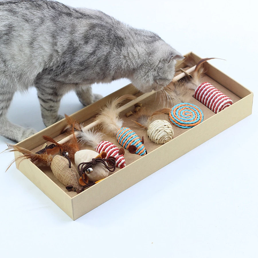 Интерактивная палочка для кошек, набор игрушек, 7 шт. сменных перьев, забавная игрушка для кошек, подарочный набор, натуральный твердый деревянный Льняной материал для подарочной коробки