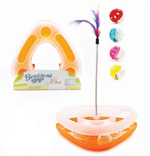 Игровой трек-головоломка с шариком-погремушкой и съемными перышками на пружинке. Данная игрушка привлечет внимание Вашей кошечки/котика. Яркий и звенящий мячик катается по кругу, а дразнящие яркие перышки не оставят равнодушным ни одного кота. Данная игрушка стимулирует активность и переключает внимание питомца на игру.