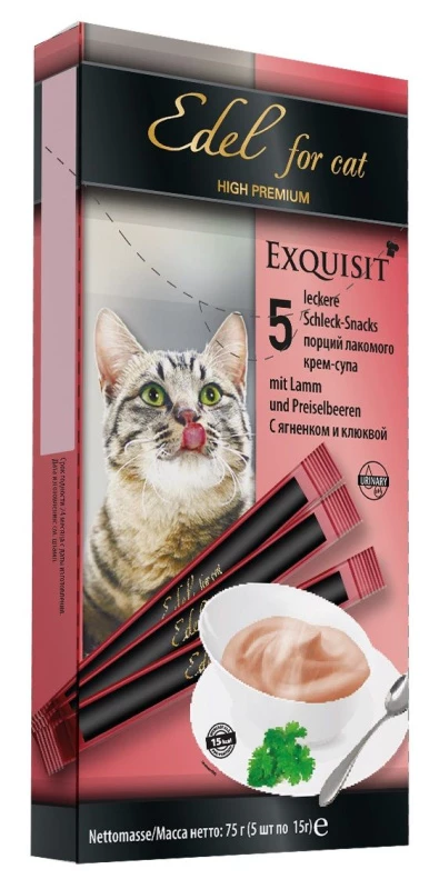 Крем-суп с ягненком, в каждой порции менее 15 ккал, содержание жира меньше 4%. Высокая влажность продукта улучшает функции почек. Крем-суп Edel содержит также клюкву, для профилактики МКБ. Низкокалорийно. Повышает потребление воды в качестве соуса для повышения вкусовой привлекательности корма. Состав: ягненок, сливки молочные, мука пшеничная, масло растительное, таурин, рыбий жир, дрожжи, клюква сырой протеин теин 4,0%, сырой жир 3,5%, сырая зола 2,0%, сырая клетчатка 0,2%, влажность 87,0%.