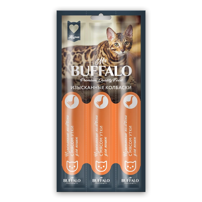 Изысканные колбаски Mr. Buffalo Duck flavor cat sticks — это аппетитное и полезное угощение, которое придется по вкусу даже самой привередливой и избалованной кошке. Каждая колбаска индивидуально упакована, что позволяет сохранить запах и вкусовые качества надолго. Лакомство содержит таурин — важную аминокислоту для здоровья сердечно-сосудистой системы и остроты зрения. Угощая кошку лакомствами Mr. Buffalo, вы не только дарите ей радость, но и заботитесь о ней.