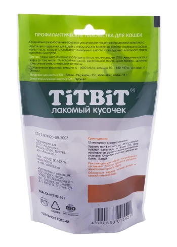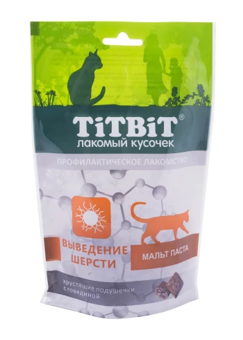 Профилактические лакомства для кошек TiTBiT - специально разработанные полезные угощения для поддержания здоровья животного. Хрустящие подушечки для кошек с говядиной для выведения шерсти, содержат в составе мальт-пасту, которая способствует выведению шерсти из желудочно-кишечного тракта естественным путём.