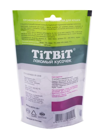 Профилактические лакомства для кошек TiTBiT - специально разработанные полезные угощения для поддержания здоровья животного. Хрустящие подушечки для кошек с мясом индейки для здоровья сердца, содержат в составе таурин и витамины, которые способствуют улучшению деятельности сердечно-сосудистой системы.