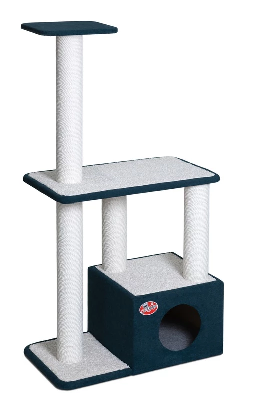 Четыре столбика для точки когтей, дополнительная полочка и домик, сделают счастливой жизнь вашей кошки в домашних условиях. Благодаря небольшой высоте по соотношению к площади, комплекс является очень устойчивым.