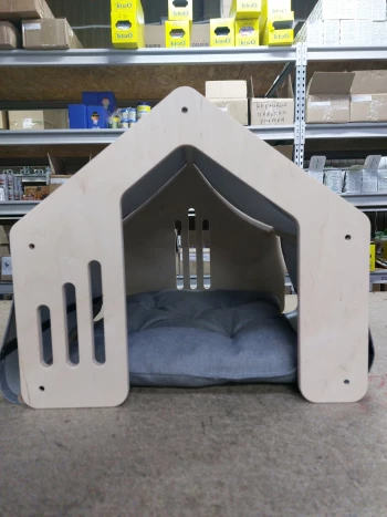 Стильный, укромный, полностью разборный домик для питомца. Выполнен из дерева и фанеры.