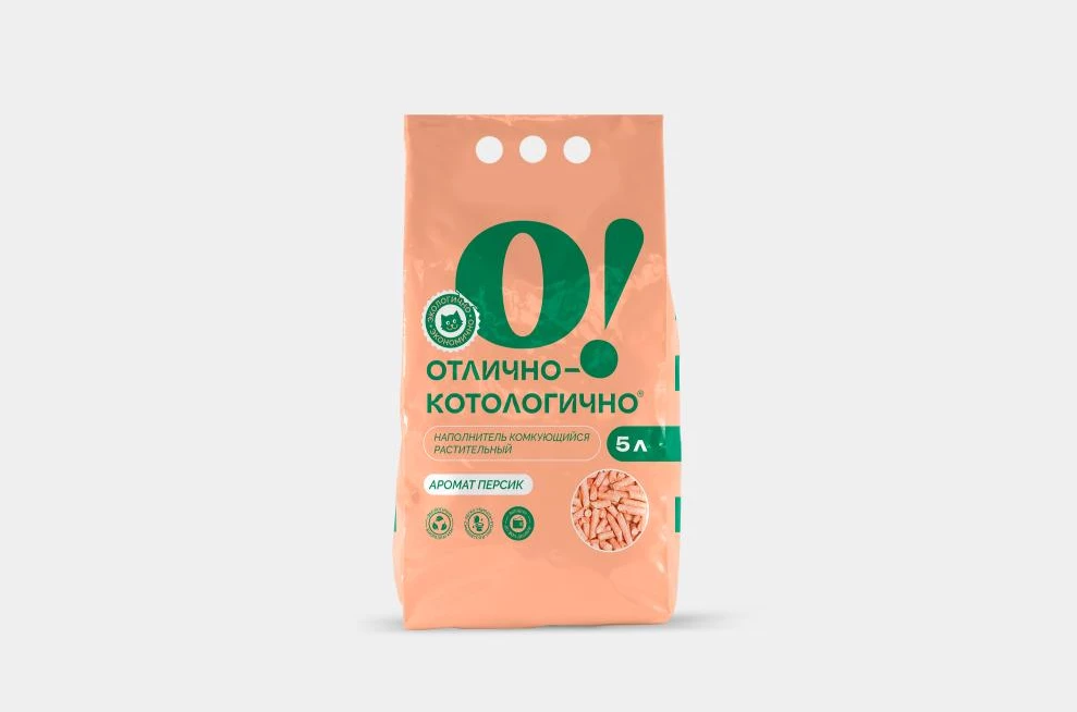 Эконом-вариант растительного наполнителя, в котором в качестве основного сырья используется дробленое зерно. Несмотря на то, что наполнитель имеет больший расход по сравнению с растительными наполнителями премиум-сегмента, его использование все равно является более выгодным, чем использование, например, минерального наполнителя, поскольку расход наполнителя «О! Отлично-котологично» несравнимо меньше, чем у наполнителей из различных видов глины. При этом он намного лучше справляется с запахом из лотка. Состав: Продукты зернопереработки (дробленое зерно) • Натуральный стабилизатор • Древесная мука, являющаяся природным антисептиком • Компонент для работы с запахом • Пищевой краситель • Ароматизатор "персик", идентичный натуральному Смывается в унитаз!