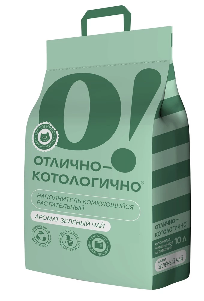 Эконом-вариант растительного наполнителя, в котором в качестве основного сырья используется дробленое зерно. Несмотря на то, что наполнитель имеет больший расход по сравнению с растительными наполнителями премиум-сегмента, его использование все равно является более выгодным, чем использование, например, минерального наполнителя, поскольку расход наполнителя «О! Отлично-котологично» несравнимо меньше, чем у наполнителей из различных видов глины. При этом он намного лучше справляется с запахом из лотка. Состав: Продукты зернопереработки (дробленое зерно) • Натуральный стабилизатор • Древесная мука, являющаяся природным антисептиком • Компонент для работы с запахом • Пищевой краситель • Ароматизатор "зеленый чай", идентичный натуральному Смывается в унитаз!