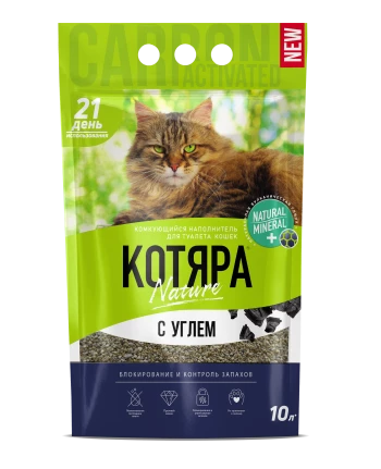 Комкующийся наполнитель Котяра с углем обладает отличными адсорбирующими свойствами. Благодаря пористой структуре угля эффективно борется с неприятными запахами, усиливая действие бентонитовых глин. Специально подобранный размер гранул, не ранит лапки животного и не прилипает к шерсти.