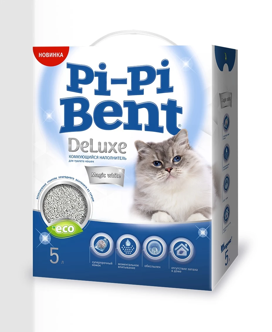 Новый продукт в линейке комкующихся бентонитовых наполнителей для туалета кошек супер-премиального класса - Pi-Pi Bent Deluxe Magic white.
