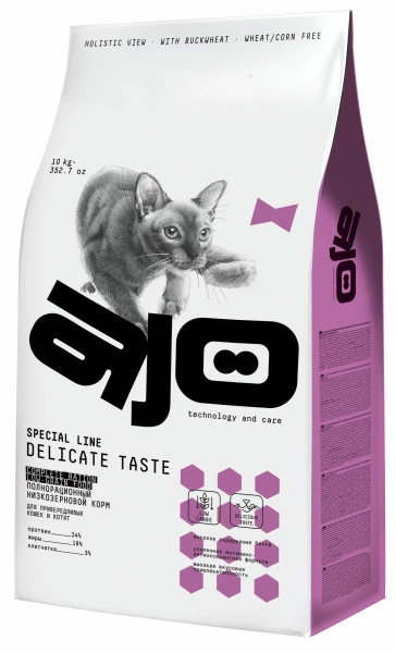 Ингредиенты: дегидрированное мясо (индейка 15%, курица 9%, свинина 8%), рис, жир животный, хлопья овсяные, рисовый протеин, гидролизованные мясные белки (вкусоароматическая добавка), дрожжи пивные сухие, яблочный жом, жир лососевый, брокколи, цикорий (источник инулина), экстракт юкки Шидигера, розмарин, таурин, лютеин (экстракт бархатцев), экстракт зеленого чая (источник полифенолов), минеральные вещества, витамины: А, D, Е, С, холин хлорид (В4), никотиновая кислота (В3), пантотеновая кислота (В5), рибофлавин (В2), пиридоксин (В6), тиамин (В1), фолиевая кислота (Вc), биотин (Н), цианокобаломин (В12). . Аналитический состав: протеин-34%, жир-18%, клетчатка-3,0%, зола-7,5%, кальций -1.3%, фосфор-0.9%, влажность-8%. Добавки: А -20 000МЕ/кг, D3-1000 МЕ/кг, С-200мг/кг, Е -500 МЕ/кг., йод-3,0 мг/кг, селен-0,2мг/кг. Омега 6 и 3 жирные кислоты – 3.2%. Подробнее: https://kotmatros.ru/ajo-cat-delicate-taste-suhoj-korm-dlya-priveredlivyh-koshek-i-kotyat-s-indejkoj-10-kg/#composition?utm_campaign=copy