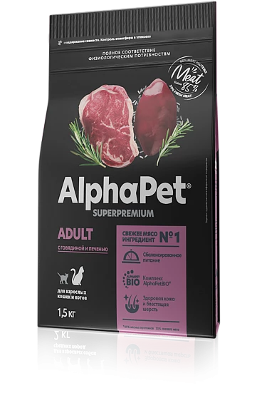 Сухой корм для кошек AlphaPet SUPERPREMIUM Говядина/печень 1,5кг
