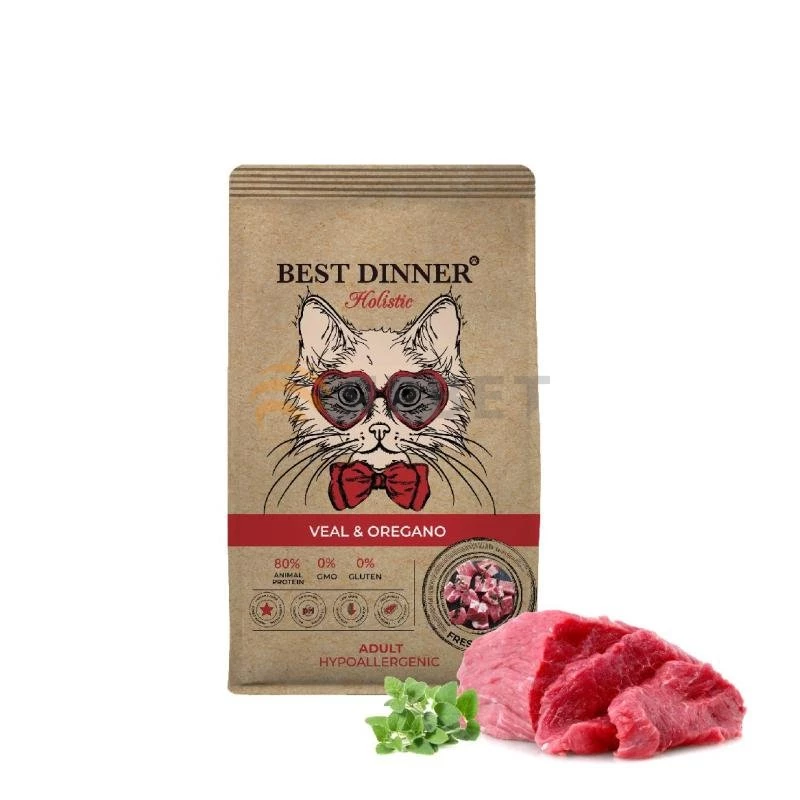 Низкозерновая рецептура для кошек Best Dinner с телятиной и орегано, изготовлена с учетом физиологических потребностей кошек. Свежая телятина с добавлением мяса индейки обогащают рацион необходимыми аминокислотами, а так же делают его потрясающе вкусным и полезным. Орегано, благодаря эфирным маслам, улучшает работу желудочно-кишечного тракта, препятствует вздутию живота. Корень цикория способствует размножению полезной кишечной микрофлоры. Гранулы в форме сердечек не оставят равнодушными даже самых привередливых кошек.