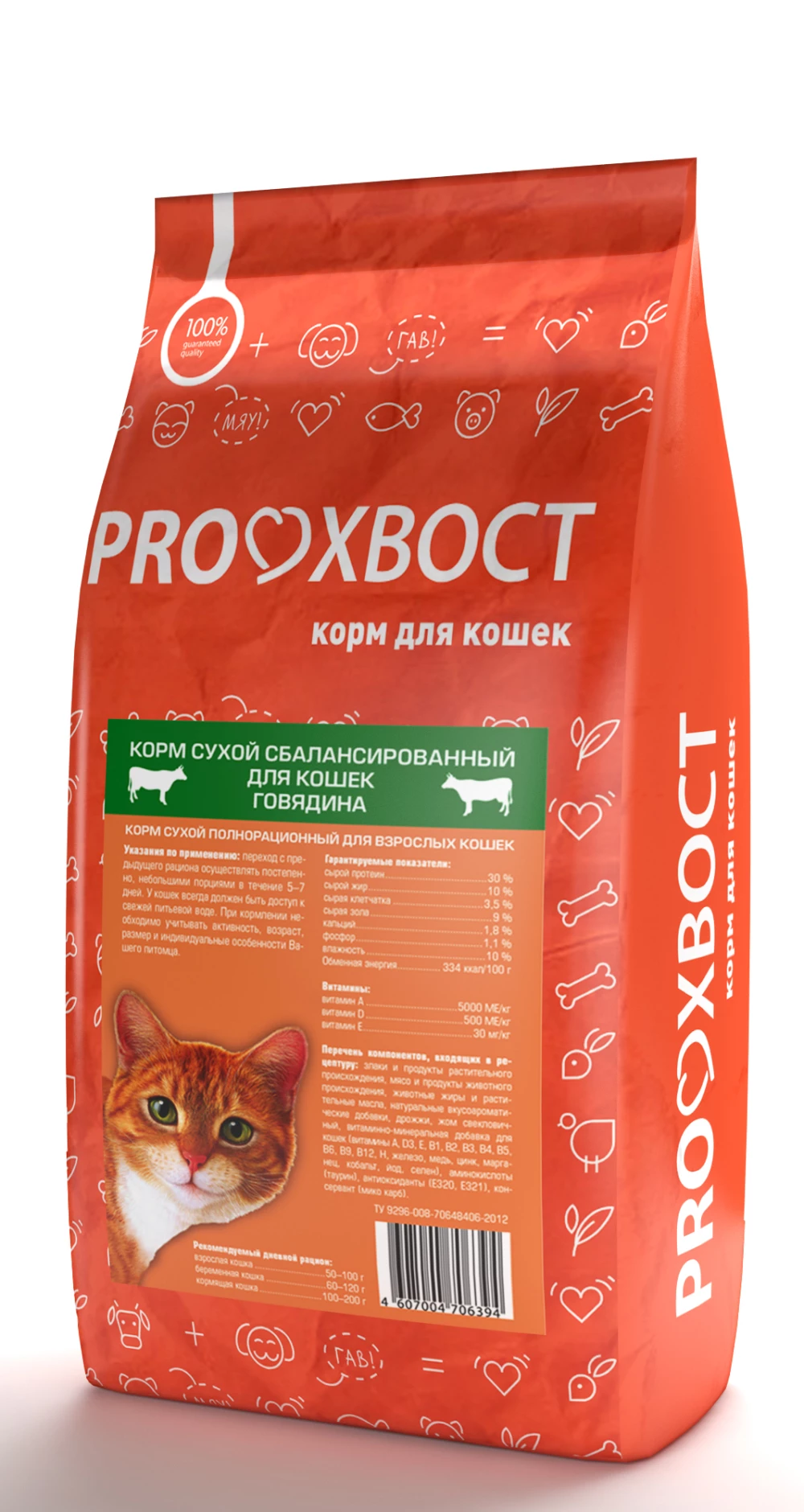 Состав: злаки и продукты растительного происхождения, мясо и продукты животного происхождения, животные жиры и растительные масла, натуральные вкусоароматические добавки, дрожжи, жом свекловичный, витаминно-минеральная добавка для кошек (витамины А, D3, Е, В1, В2, В3, В4, В5, В6, В9, В12, Н, железо, медь, цинк, марганец, йод, селен), аминокислоты (таурин), антиоксиданты (Е320, Е321), консервант (мико карб).