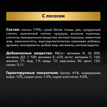 лосось (19%), сухой белок птицы, рис, кукурузный глютен, пшеничный глютен, кукуруза, волокна пшеницы, клечатка, минеральные вещества, яичный порошок, животный жир, аминокислоты, вкусоароматическая кормовая добавка, дрожжи, консерванты, рыбий жир, витамины, антиоксиданты.