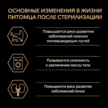 Для поддержания здоровья стерилизованных кошек. PRO PLAN Sterilised сочетает все основные питательные вещества, включая витамины A, C и E и жирные кислоты омега-3 и омега-6, в богатой белками, нежирной рецептуре, которая также помогает обеспечить сбалансированный уровень pH мочи.