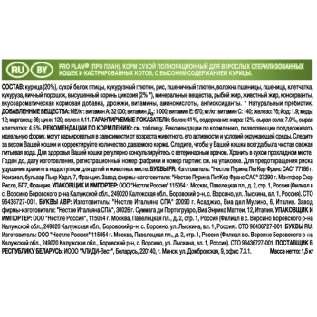 Для поддержания здоровья стерилизованных кошек. PRO PLAN Sterilised сочетает все основные питательные вещества, включая витамины A, C и E и жирные кислоты омега-3 и омега-6, в богатой белками, нежирной рецептуре, которая также помогает обеспечить сбалансированный уровень pH мочи.