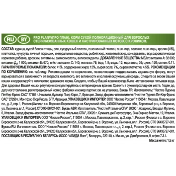 Состав: курица, сухой белок птицы, рис, кукурузный глютен, пшеничный глютен, пшеница, волокна пшеницы, кролик (4%), клетчатка, кукуруза, яичный порошок, минеральные вещества, рыбий жир, животный жир, консерванты, вкусоароматическая кормовая добавка, дрожжи, витамины, аминокислоты.