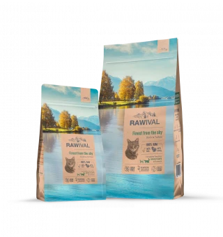 Полнорационный сухой корм ультрапремиум-класса на основе утки и индейки для взрослых кошек. Высокое содержание белка из свежего мяса птицы, отсутствие злаков и натуральные необработанные ингредиенты делают Rawival питанием, предназначенным самой природой. ИНГРЕДИЕНТЫ: сырая бескостная утка (20%), сырая бескостная индейка (16%), гороховый крахмал, дегидратированный белок утки (11%), дегидратированный белок индейки (11%), куриный жир, рыбий жир (из лосося), экстракт семян киноа, гидролизованный белок рыбы (треска, пикша), гидролизованный белок птицы (курица, индейка), куриные потроха (печень, сердце, почки), сушёные цельные яйца, льняное семя, сушёная свекольная пульпа, мука из люцерны, гороховая клетчатка, инулин цикория (0,4%), экстракт дрожжей (источник маннанолигосахаридов) (0,3%), фруктоолигосахариды (0,3%), сушёный аскофиллум узловатый, карбонат кальция, монокальцийфосфат, хлорид калия, хлорид натрия, сушёные пивные дрожжи, сушёная ацерола, сушёная тыква, сушёная черника, сушёная клюква, сушёное яблоко, сушёная спаржа, алоэ вера, сушёный розмарин, сушёная куркума, сушёная календула, семена и шелуха семян подорожника, экстракт юкки Шидигера. В связи с особенностями производства готовый продукт может содержать в следовых количествах растительные и животные белки (курица, индейка, говядина, баранина, кролик, утка, свинина, рыба, коза, гусь), которые используются заводом в других рецептурах.