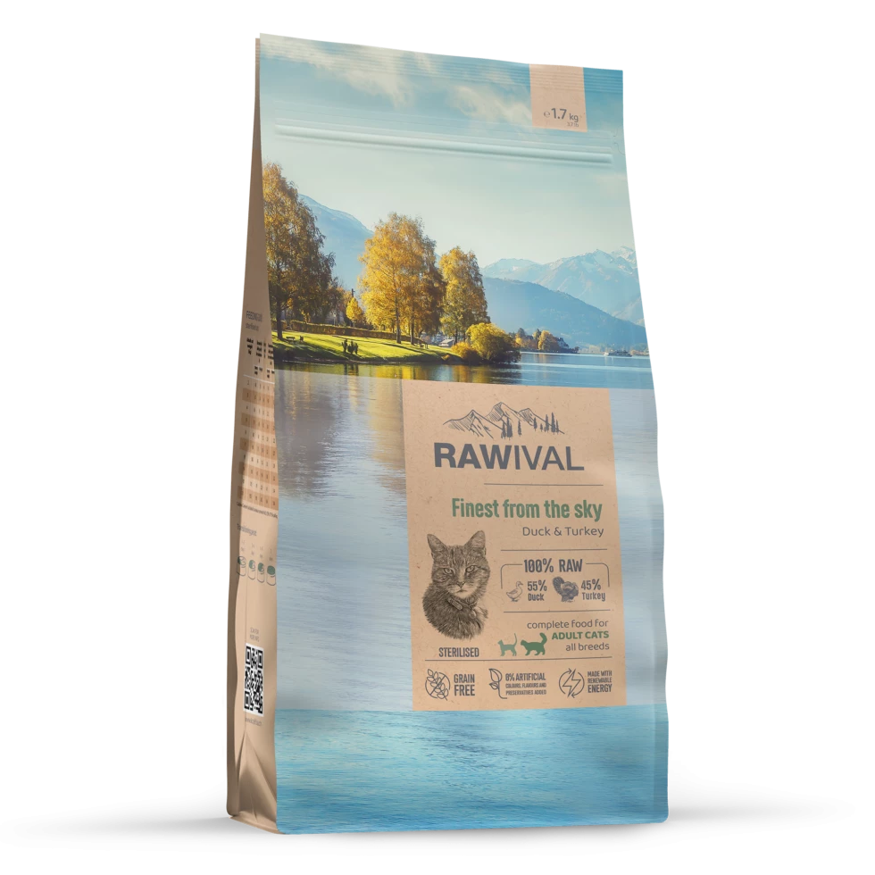 ИНГРЕДИЕНТЫ: сырая бескостная утка (21%), сырая бескостная индейка (17%), гороховый крахмал, дегидратированный белок утки (11%), дегидратированный белок индейки (11%), куриный жир, экстракт семян киноа, гидролизованный белок рыбы (треска, пикша), гидролизованный белок птицы (курица, индейка), куриные потроха (печень, сердце, почки), сушёные цельные яйца, рыбий жир (из лосося), сушёная свекольная пульпа, льняное семя, мука из люцерны, гороховая клетчатка, монокальцийфосфат, хлорид калия, карбонат кальция, инулин цикория (0,4%), экстракт дрожжей (источник маннанолигосахаридов) (0,3%), фруктоолигосахариды (0,3%), сушёные пивные дрожжи, сушёная ацерола, сушёная тыква, сушёная черника, сушёная клюква, сушёное яблоко, сушёная спаржа, хлорид натрия, сушёный аскофиллум узловатый, сушёный розмарин, сушёная куркума, сушёная календула, семена и шелуха семян подорожника, экстракт юкки Шидигера. В связи с особенностями производства готовый продукт может содержать в следовых количествах растительные и животные белки (курица, индейка, говядина, баранина, кролик, утка, свинина, рыба, коза, гусь), которые используются заводом в других рецептурах. Полнорационный сухой корм ультрапремиум-класса на основе утки и индейки для стерилизованных кошек. Высокое содержание белка из свежего мяса, отсутствие злаков и натуральные необработанные ингредиенты делают Rawival питанием, предназначенным самой природой.