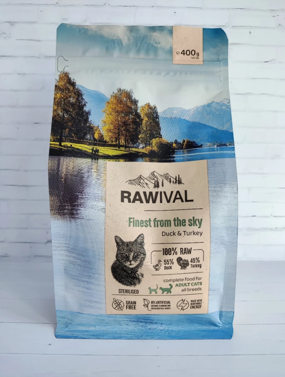 Состав: Сырая бескостная утка (21%), сырая бескостная индейка (17%), гороховый крахмал, дегидратированный белок утки (11%), дегидратированный белок индейки (11%), куриный жир, экстракт семян киноа, гидролизованный белок рыбы (треска, пикша), гидролизованный белок птицы (курица, индейка), куриные потроха (печень, сердце, почки), сушёные цельные яйца, рыбий жир (из лосося), сушёная свекольная пульпа, льняное семя, мука из люцерны, гороховая клетчатка, монокальцийфосфат, хлорид калия, карбонат кальция, инулин цикория (0,4%), экстракт дрожжей (источник маннанолигосахаридов) (0,3%), фруктоолигосахариды (0,3%), сушёные пивные дрожжи, сушёная ацерола, сушёная тыква, сушёная черника, сушёная клюква, сушёное яблоко, сушёная спаржа, хлорид натрия, сушёный аскофиллум узловатый, сушёный розмарин, сушёная куркума, сушёная календула, семена и шелуха семян подорожника, экстракт юкки Шидигера.