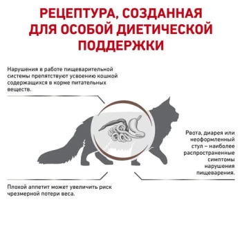 Сухой корм ROYAL CANIN® GASTROINTESTINAL – полнорационный диетический корм для кошек, рекомендуемый при острых расстройствах пищеварения, в реабилитационный период и при истощении. Легкоусвояемые ингредиенты. Дополнительное количество электролитов и высокое содержание основных питательных веществ. Высокая калорийность.