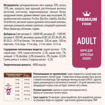 Состав: Дегидрированное мясо (птица 18% лосось 14%), рис, кукуруза, жир куриный, гидролизованные мясные белки, кукурузный глютен, дрожжи сухие, жир лососевый 2%, пробиотический комплекс ProStor Bio Care (Bacillus subtillis, Bacillus licheniformis, автолизат пивных дрожжей, пектиновый комплекс, эхинацея, ро- машка),тыква сушенная, шпинат сушенный, клюква сушенная, Юкка Шидигера, экстракт розмарина, таурин.