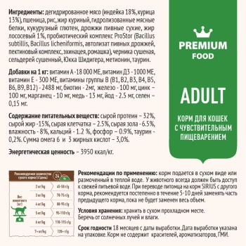 SIRIUS - сухой корм премиум класса для полноценного ежедневного питания взрослых кошек с чувствительным пищеварением. Высокое содержание мясных ингредиентов обеспечивает оптимальный уровень белка и укрепляет мышцы. Пониженное содержание жиров для контроля веса. Баланс витаминов и комплекса пробиотиков 4-го поколения PROSTOR+ нормализует пищеварение и укрепляет иммунитет. Омега 3 и Омега 6 способствуют поддержанию здоровья сердца, мозга, нервной системы, здоровья кожи и красоты шерсти. Черника обладает бактерицидными свойствами и способствует обновлению клеток.