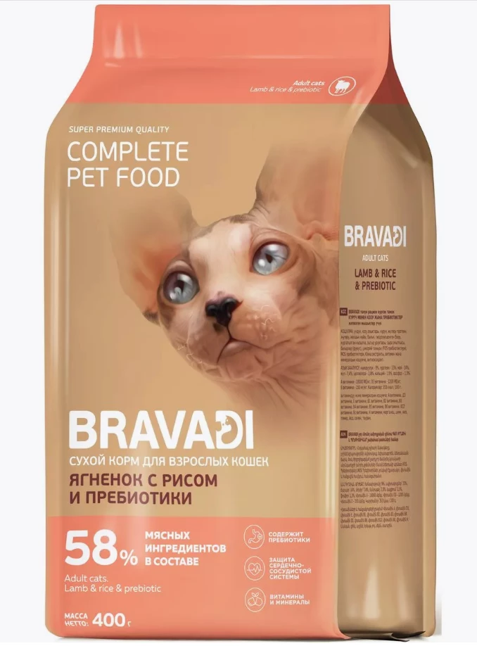 Состав Индейка, субпродукты ягненка, рис, маисовый белок, маис, животный жир, рыба, гидролизированная печень, пульпа свеклы, семя льняное, дрожжи пивные, морские водоросли (фукус), корень цикория (пребиотики ФОС), пребиотики МОС, экстракт Юкки, витаминно-минеральная добавка, антиоксидант. ПИЩЕВАЯ ЦЕННОСТЬ: влажность - 9%, протеин - 33%, жир - 14%, зола - 7,4%, клетчатка - 2,8%, кальций - 1,5%, фосфор – 1,3%. Витамин А – 18000 МЕ/кг, Витамин Д3 – 1200 МЕ/кг, Витамин Е - 150 мг/кг. Калорийность: 353 ккал/100 г. Сухой корм BRAVADI взрослым кошкам – это полноценный рацион, который предназначен для кормления взрослых кошек старше 1 года. Разработан и произведен с учетом потребностей кошки: отличные вкусовые качества и сбалансированное соотношение белков и жиров для оптимального развития и поддержания питомца на всех этапах жизни. Полное разнообразие всех видов животного белка – ягненок, индейка и рыба - обеспечивает необходимое высокое содержание протеина, витаминов и микроэлементов, а также вкусовую привлекательность корма. Содержит таурин, необходимый кошкам для нормального функционирования сердечной мышцы, здоровья зрения, поддержания здоровой иммунной системы. Пребиотики, содержащиеся в корме, улучшают рост и размножение полезной микрофлоры кишечника, нормализуют пищеварение, сохраняя баланс в кишечнике, и укрепляют иммунитет. Корм обогащен комплексом витаминов и минералов для поддержания правильного обмена веществ в организме. Не содержит красителей и искусственных ароматизаторов.