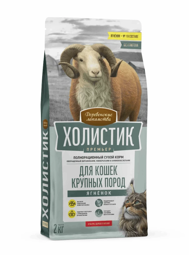 Полнорационный корм «Деревенские лакомства Холистик Премьер для кошек крупных пород. Ягнёнок» разработан с учетом физиологических особенностей питомцев.