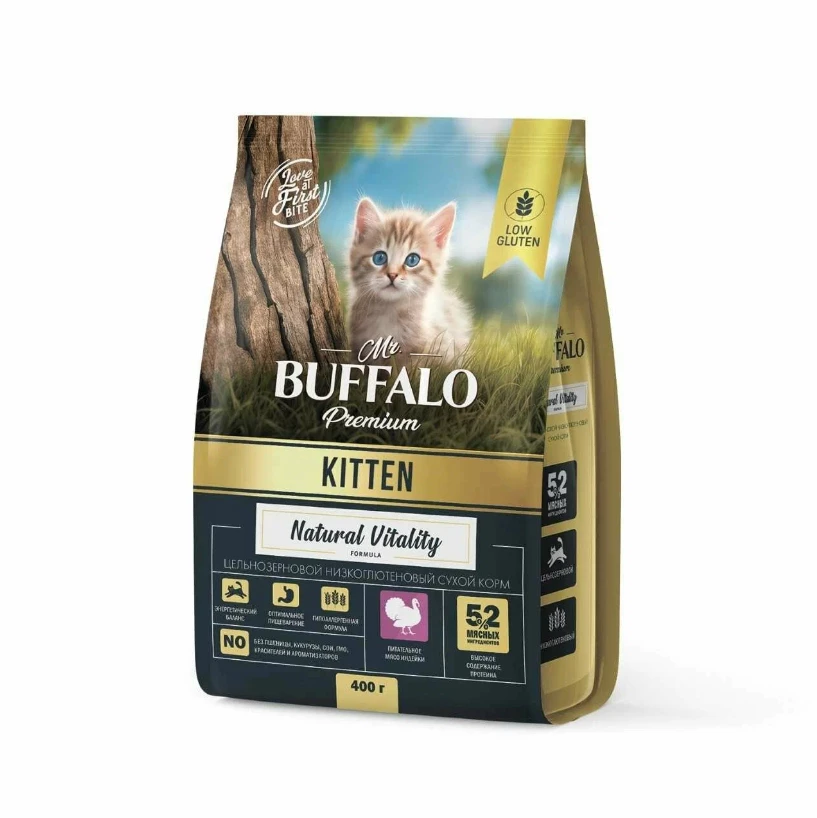 Корм для котят сухой полнорационный премиум класса Mr. Buffalo KITTEN с индейкой. Сухой корм Мистер Баффало для котят содержит оптимальное количество белков, жиров и углеводов. Уникальное сочетание ингредиентов и эксклюзивная технология производства обеспечивают непревзойдённые пищевые свойства корма: поддерживают иммунитет и гармоничное развитие котят, глюкозамин и хондроитин обеспечивают здоровые связки и суставы, сбалансированный уровень минералов для крепких костей и зубов. Именно на потребности котят рассчитан витаминно-минеральный премикс. Одним из ключевых компонентов сухого корма Mr. Buffalo является уникальная запатентованная добавка бета-глюкан, которая является натуральным иммуностимулятором. Бета-глюкан активизирует естественные функции организма кошек и собак, помогает им бороться с инфекциями, поддерживает здоровое пищеварение, повышает сопротивляемость организма к бактериям, вирусам, грибкам и понижает риск различных заболеваний. Аминокислота DL-метионин в составе корма – отвечает за обмен жиров в организме, а также не позволяет жирам откладываться в печени и на стенках сосудов, клюква обеспечивает здоровье мочеполовой системы и профилактику заболеваний МКБ,Омега-3, Омега-6 обеспечивают поддержку иммунитета животного, здоровую кожу и отличную шерсть. Mr. Buffalo Kitten специально разработан для обеспечения потребностей котят, чтобы они получали лучший старт в жизни и росли в полном соответствии со своим потенциалом. Зоотовары для котят и кошек с сбалансированным составом - наша главная задача.