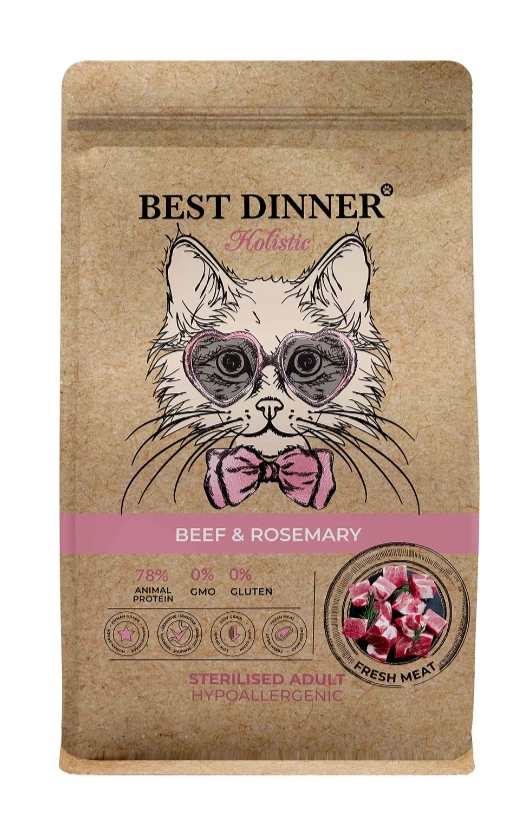 Высококачественный низкозерновой рацион для кошек Best Dinner Говядиной и розмарином не оставит равнодушным ни одного пушистого гурмана. Свежее мясо говдины с добавлением индейки обладают высокой вкусовой привлекательностью и не нагружают работу желудочно кишечного тракта. Ароматный розмарин не только повышает вкусовую привлекательность корма, но и улучшают работу ЖКТ, а добавленные яблоки и корень цикория обеспечивают питание и развитие полезной кишечной микрофлоры. Добавленный DL -метионин профилактирует развитие мочекаменной болезни. Гранулы в форме сердечек не оставят равнодушными даже самых привередливых кошек.