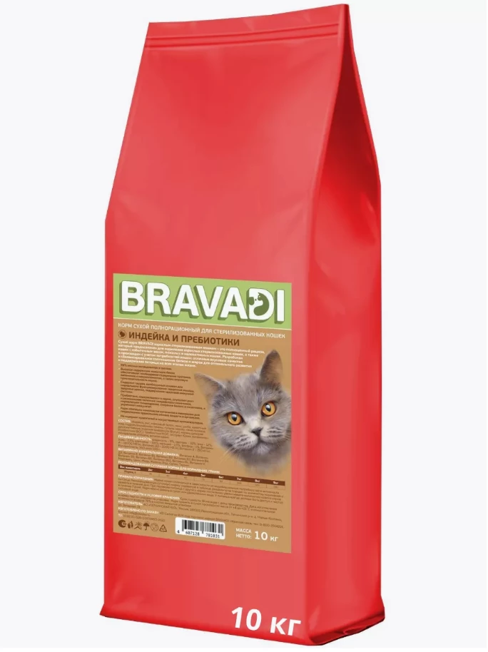 Состав: Индейка, рис, маисовый белок, маис, рыба, животный жир, гидролизированная печень, пульпа свеклы, семя льняное, дрожжи пивные, морские водоросли (фукус), корень цикория (пребиотики ФОС), пребиотики МОС, экстракт Юкки, витаминно-минеральная добавка, антиоксидант. ПИЩЕВАЯ ЦЕННОСТЬ: влажность - 9%, протеин - 32%, жир - 12%, зола - 7,3%, клетчатка - 3,6%, кальций - 1,5%, фосфор - 1%. Витамин А – 18000 МЕ/кг, Витамин Д3 – 1000 МЕ/кг, Витамин Е - 150 мг/кг. Калорийность: 340 ккал/100 г. Сухой корм BRAVADI взрослым стерилизованным кошкам – это полноценный рацион, который предназначен для кормления взрослых стерилизованных кошек, а также кошек с избыточным весом, пожилых и малоактивных кошек. Разработан и произведен с учетом потребностей кошки: отличные вкусовые качества и сбалансированное соотношение белков и жиров для оптимального развития и поддержания питомца на всех этапах жизни. Высокое содержание животного белка обеспечивает необходимое содержание протеина, витаминов и микроэлементов, а также вкусовую привлекательность корма. Содержит таурин, необходимый кошкам для нормального функционирования сердечной мышцы, здоровья зрения, поддержания здоровой иммунной системы. Пребиотики, содержащиеся в корме, улучшают рост и размножение полезной микрофлоры кишечника, нормализуют пищеварение, сохраняя баланс в кишечнике, и укрепляют иммунитет. Корм обогащен комплексом витаминов и минералов для поддержания правильного обмена веществ в организме. Не содержит красителей и искусственных ароматизаторов.
