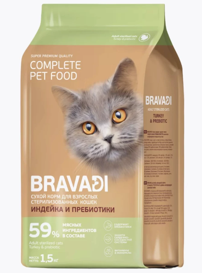 Состав: Индейка, рис, маисовый белок, маис, рыба, животный жир, гидролизированная печень, пульпа свеклы, семя льняное, дрожжи пивные, морские водоросли (фукус), корень цикория (пребиотики ФОС), пребиотики МОС, экстракт Юкки, витаминно-минеральная добавка, антиоксидант. ПИЩЕВАЯ ЦЕННОСТЬ: влажность - 9%, протеин - 32%, жир - 12%, зола - 7,3%, клетчатка - 3,6%, кальций - 1,5%, фосфор - 1%. Витамин А – 18000 МЕ/кг, Витамин Д3 – 1000 МЕ/кг, Витамин Е - 150 мг/кг. Калорийность: 340 ккал/100 г. Сухой корм BRAVADI взрослым стерилизованным кошкам – это полноценный рацион, который предназначен для кормления взрослых стерилизованных кошек, а также кошек с избыточным весом, пожилых и малоактивных кошек. Разработан и произведен с учетом потребностей кошки: отличные вкусовые качества и сбалансированное соотношение белков и жиров для оптимального развития и поддержания питомца на всех этапах жизни. Высокое содержание животного белка обеспечивает необходимое содержание протеина, витаминов и микроэлементов, а также вкусовую привлекательность корма. Содержит таурин, необходимый кошкам для нормального функционирования сердечной мышцы, здоровья зрения, поддержания здоровой иммунной системы. Пребиотики, содержащиеся в корме, улучшают рост и размножение полезной микрофлоры кишечника, нормализуют пищеварение, сохраняя баланс в кишечнике, и укрепляют иммунитет. Корм обогащен комплексом витаминов и минералов для поддержания правильного обмена веществ в организме. Не содержит красителей и искусственных ароматизаторов.