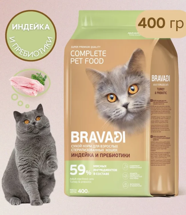 Состав: Индейка, рис, маисовый белок, маис, рыба, животный жир, гидролизированная печень, пульпа свеклы, семя льняное, дрожжи пивные, морские водоросли (фукус), корень цикория (пребиотики ФОС), пребиотики МОС, экстракт Юкки, витаминно-минеральная добавка, антиоксидант. ПИЩЕВАЯ ЦЕННОСТЬ: влажность - 9%, протеин - 32%, жир - 12%, зола - 7,3%, клетчатка - 3,6%, кальций - 1,5%, фосфор - 1%. Витамин А – 18000 МЕ/кг, Витамин Д3 – 1000 МЕ/кг, Витамин Е - 150 мг/кг. Калорийность: 340 ккал/100 г. Сухой корм BRAVADI взрослым стерилизованным кошкам – это полноценный рацион, который предназначен для кормления взрослых стерилизованных кошек, а также кошек с избыточным весом, пожилых и малоактивных кошек. Разработан и произведен с учетом потребностей кошки: отличные вкусовые качества и сбалансированное соотношение белков и жиров для оптимального развития и поддержания питомца на всех этапах жизни. Высокое содержание животного белка обеспечивает необходимое содержание протеина, витаминов и микроэлементов, а также вкусовую привлекательность корма. Содержит таурин, необходимый кошкам для нормального функционирования сердечной мышцы, здоровья зрения, поддержания здоровой иммунной системы. Пребиотики, содержащиеся в корме, улучшают рост и размножение полезной микрофлоры кишечника, нормализуют пищеварение, сохраняя баланс в кишечнике, и укрепляют иммунитет. Корм обогащен комплексом витаминов и минералов для поддержания правильного обмена веществ в организме. Не содержит красителей и искусственных ароматизаторов.