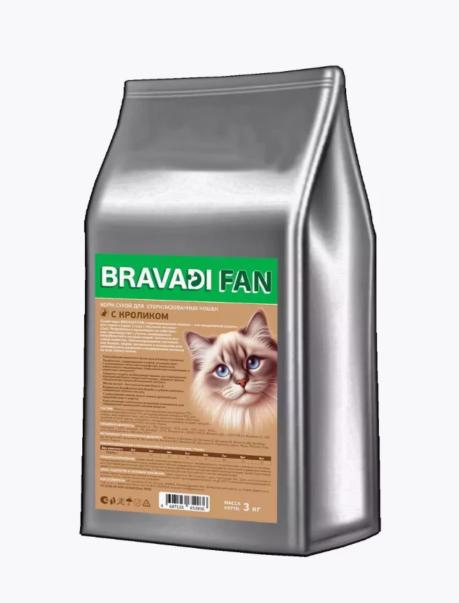 Состав: дегидрированная индейка (27%), гидролизованный кролик (7%), дегидрированную говядину (6%), а также рис, ячмень, жир индейки, маис, масло лосося, дрожжи пивные, семя льна, сушеная пульпа свеклы, витаминно-минеральную добавку, сульфат кальция и Ascophyllum. Сухой корм Bravadi FAN с кроликом - разработан специально для заботливых владельцев стерилизованных кошек и кастрированных котов, которые хотят обеспечить своих животных всем для здоровья и счастья. Диетический корм Bravadi FAN специально для кошек, после стерилизации и кастрации, чтобы помочь им поддерживать оптимальный вес и здоровье. Сухой корм Bravadi FAN с кроликом - это натуральные ингредиенты, которые обеспечат кошек всем необходимым. Кролик - это легкоусвояемый источник белка, он помогает поддержать мышечную массу и обеспечить кошек энергией на целый день. Злаки, в составе сухого корма Bravadi FAN, имеют разный гликемический индекс и необходимы для насыщения организма и поддержанием сытости между кормлениями кошки. Основным источником жира является жир индейки – отлично усваивается, улучшает вкус гранулы, богат Омега-6 жирными кислотами и содержит много витаминов D и E, а также холин и селен. Пребиотические продукты (пульпа свеклы, пребиотики МОС, дрожжи сухие пивные) содержащиеся в сухом корме Bravadi FAN для кошек, улучшают рост и размножение полезной микрофлоры кишечника, нормализуют пищеварение и укрепляют иммунитет. Водоросли Аскофиллум - источник важного микроэлемента йод. Он необходим для работы мышечных и нервных тканей кошки, сохранения здоровья кожи и шерсти. Сухой корм Bravadi FAN с кроликом и рисом идеально подходит для стерилизованных кошек. В корме пониженное содержание кальция, фосфора и магния, он подходит для профилактики МКБ. Этот сухой корм для кошек содержит все необходимые витамины и минералы, которые помогают поддерживать здоровье кожи, шерсти, зубов и десен. Диетический корм Bravadi FAN с кроликом и рисом для стерилизованных кошек легкоусвояемый и не содержит красителей и ароматизаторов. В производстве используются продукты, пригодные для питания человека.