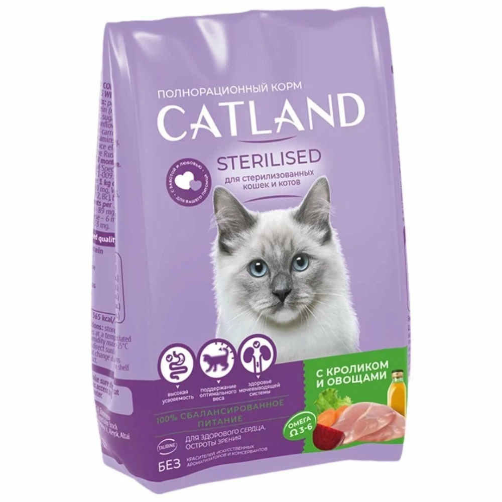 Сухой полнорационный корм Catland премиум класса 1,3 кг. *2 штуки = Общий вес 2,6 кг. разработан для ежедневного кормления взрослых стерилизованных кошек и котов всех пород.