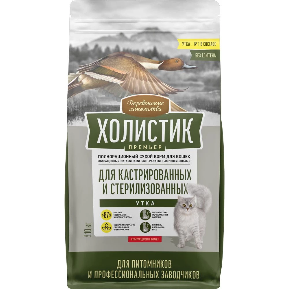 Серия полнорационных кормов «Холистик Премьер «Для кастрированных и стерилизованных» разработана специально для котов и кошек с особыми потребностями в рационе. Идеально сбалансированный, обогащенный необходимыми витаминами и аминокислотами, этот корм обеспечивает контроль за весом, поддерживает здоровье мочевыводящих путей и укрепляет естественный иммунитет. СОСТАВ: Свежая утка — 48 %, дегидрированная говядина — 14 %, дегидрированный анчоус — 11 %, куриный жир, рис, тапиоковая мука, масло лосося — 2 %, сушёные пивные дрожжи (источник пребиотика MOS), витаминно-минеральный комплекс (А, D3, E, B1, B2, B6, B12, ниацин (B3), холина хлорид, железо, медь, марганец, цинк, таурин, L-лизин), сушёная тыква, сушёные яблоки, сельдерей, люцерна, шелковица, пустырник, спирулина, сушёная клюква, юкка Шидигера. Из-за использования на производстве возможны остаточные следы: кролика, индейки, баранины, рыбы, ракообразных, моллюсков, орехов, кунжута, молочных продуктов, сои, яиц, бобовых, злаков и их субпродуктов.