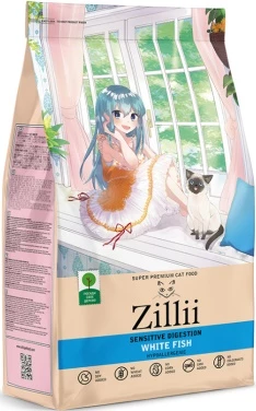 Полнорационный корм для взрослых кошек с чувствительным пищеварением Рецептура ZILLII SENSITIVE DIGESTION специально создана для кошек с чувствительным пищеварением. Белая рыба прекрасно подходит для чувствительного пищеварения из-за высокой усвояемости и гипоаллергенности. В белой рыбе рекордное количество качественного белка, при этом минимум калорий. В мясе белой рыбы содержатся в большом количестве витамины группы А и С, а также группы B (особенно важные среди них — В6 и В12), которые способствуют детоксикации организма и борются с воспалительными процессами. Из рецептуры исключены все основные ингредиенты, которые могут оказать негативное влияние именно на чувствительное пищеварен Состав: Дегидрированное мясо белой рыбы (31%), рис, просо, куриный жир, овес, горох, гороховый протеин, натуральный ароматизатор, сушеная мякоть свеклы, витамины, минералы, пивные дрожжи, семена льна, лососевое масло, яблоко, экстракт юкки шидигера, черника, морские водоросли (Ламинария), клюква, глюкозамин, хондроитин, таурин.