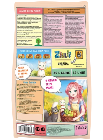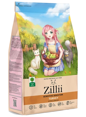 Рецептура ZILLII SENSITIVE DIGESTION специально создана для кошек с чувствительным пищеварением. Мясо индейки идеально подходит для чувствительного пищеварения из-за высокой усвояемости. Богатое витаминами А и Е, а также натрием, мясо индейки помогает обеспечивать нормальные обменные процессы в организме кошки. Из рецептуры исключены все ингредиенты, которые могут оказать негативное влияние именно на чувствительное пищеварение. Формула сбалансирована так, чтобы удовлетворить все потребности организма животного в питательных веществах, исключая любое негативное влияние на пищеварительные процессы. Такие ингредиенты как цикорий и экстракт юкки шидигера снабжают организм натуральными пребиотиками, которые способны выборочно стимулировать рост и активность полезных бактерий толстого кишечника. Пребиотики стимулируют рост нормальной микрофлоры кишечника, препятствуют возникновению дисбактериоза, нормализуют стул, предупреждают возникновение и развитие гнилостных процессов и избыточного газообразования в кишечнике, что благотворно сказывается на процессах пищеварения. Присутствующие в составе рецептуры ягоды помогают в профилактике заболеваний мочевыводящих путей, а хондропротекторы - в укреплении и поддержке суставов и связок.
