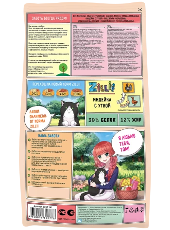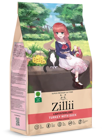 Стерилизованное животное требует к себе особого отношения касательно питания, чтобы избежать различных проблем, связанных со здоровьем. Полнорационный сухой корм ZILLII LIGHT/STERILIZED учитывает все особенности организма такой кошки, так как изготовлен на основе дегидрированного мяса индейки и свежего мяса утки. Индейка, являясь диетическим мясом, обладает прекрасной усвояемостью и содержанием питательных веществ. Польза индейки в том, что ее мясо содержит в большом количестве такие витамины, как А и Е. По содержанию натрия индейка существенно опережает даже говядину и телятину. Именно благодаря натрию происходит пополнение объемов плазмы в крови и обеспечиваются нормальные обменные процессы, что очень важно для животных с избыточным весом и стерилизованных. Утиное мясо содержит большое количество разнообразных витаминов: А, Е, К, все витамины группы В. При этом, в составе мяса утки в два раза больше витамина А, чем в любом другом виде мяса. Польза этого витамина в том, что он помогает улучшить состояние кожи и обострить зрение. Полезные свойства утиного мяса также в его насыщенности белком. Утка является наиболее богатым источником незаменимых аминокислот. Формула ZILLII LIGHT/STERILIZED Turkey with Duck содержит минимальное количество жиров, обладает низкой калорийностью и оптимальным содержание минералов, что позволяет животному избежать проблем с лишним весом и заболеваниями мочевыводящих путей. В рецептуру добавлены глюкозамин и сульфат хондроитина, благотворно влияющие на связки и суставы животного, а также натуральные пребиотики, способствующие правильному пищеварению и усвоению питательных веществ в организме.