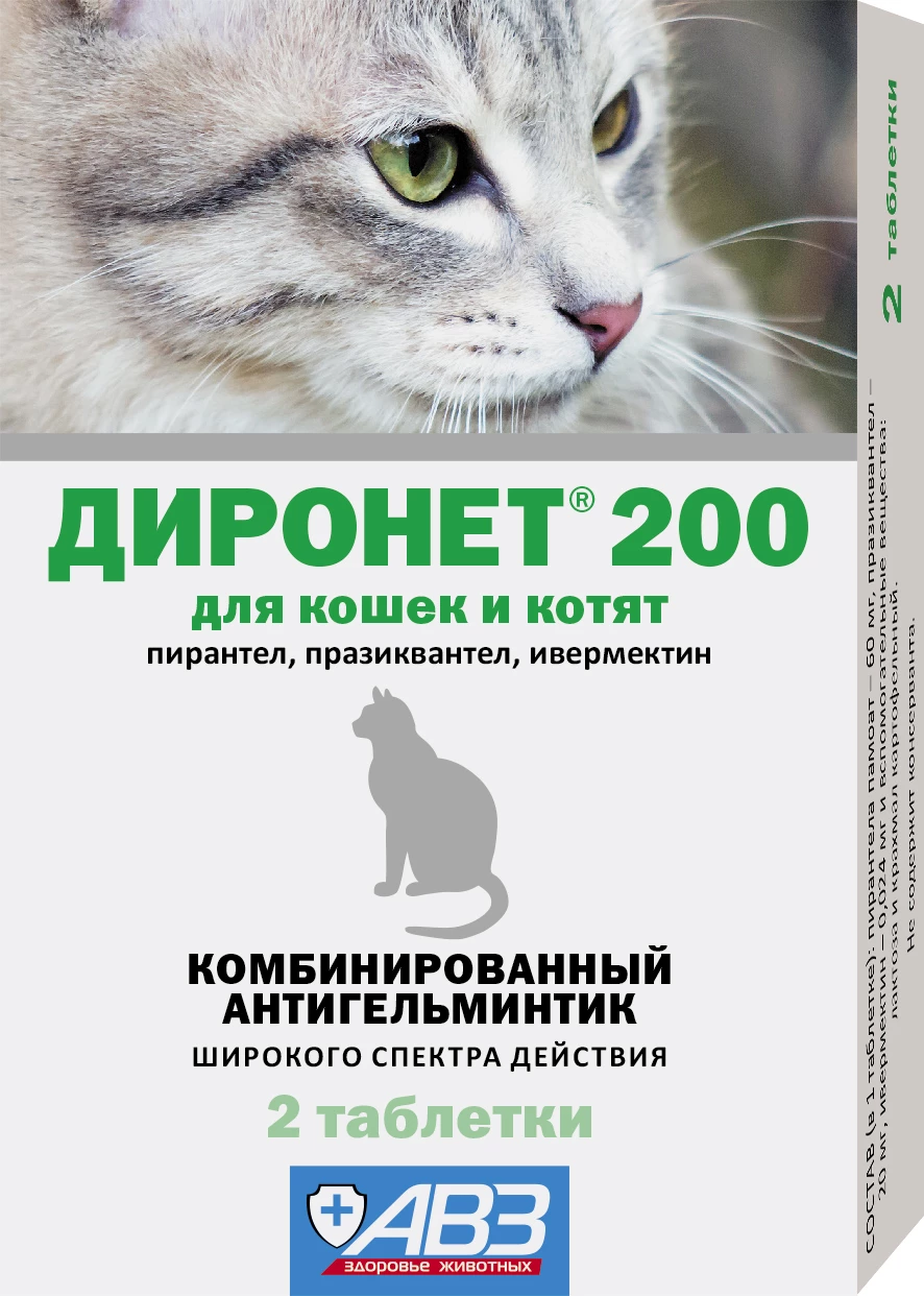 Диронет® 200 предназначен для кошек и котят, содержит в одной таблетке пирантела памоата 60 мг, празиквантела 20 мг и ивермектина 0,024 мг. Доза - 1 таблетка на 4 кг массы тела животного.