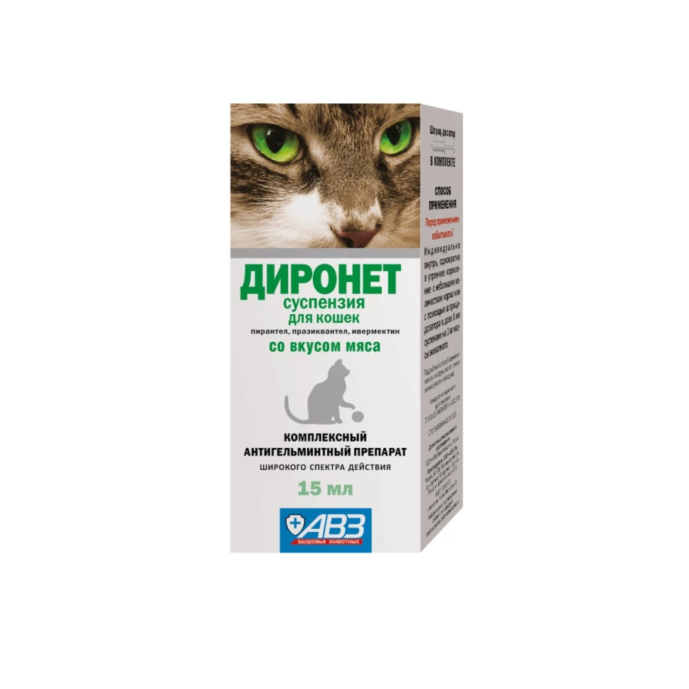Преимущества Самый широкий спектр антигельминтного действия*. Эффективное лечение и профилактика гельминтозов у собак и кошек с 3-х недельного возраста. Профилактика опаснейшего заболевания — дирофиляриоза в неблагополучных регионах. У зараженных дирофиляриозом животных препарат можно применять ежемесячно для снижения количества микрофилярий. Удобный подбор препарата по весу животного. Состав и фармакологические свойства. «Диронет» суспензия в 1 мл в качестве действующих веществ содержит: пирантела памоат – 15 мг, празиквантел – 5 мг и ивермектин – 0,006 мг и вспомогательные вещества. «Диронет» обладает широким спектром нематодоцидного и цестодоцидного действия, активен в отношении круглых и ленточных гельминтов, паразитирующих у собак и кошек, в т. ч. Toxocara canis, Т. cati, Toxascaris leonina, Uncinaria stenocephala, Ancylostoma caninum, Trichuris vulpis, Echinococcus granulosus, E. multilocularis, Diphyllobothrium latum, Dipylidium caninum, Multiceps multiceps, Taenia spp., а также личиночных фаз развития (микрофилярий) Dirofilaria immitis и Dirofilaria repens. Механизм действия ивермектина заключается в связывании с глутаматзависимыми хлорными каналами, расположенными преимущественно в глотательных и соматических мышцах. В результате увеличивается проницаемость мембраны для ионов хлора, блокируется передача нервно-мышечного импульса, наступает паралич и гибель паразита. Механизм действия пирантела памоата заключается в блокировании нейромышечной передачи, нарушении проницаемости клеточных мембран и угнетении холинэстеразы, что также приводит к параличу и гибели паразита. Механизм действия празиквантела основан на нарушении у цестод транспорта глюкозы и микротубулярной функции, угнетении активности фумаратредуктазы и синтеза АТФ, повышении проницаемости клеточных мембран и нарушении мышечной иннервации. Хранение. «Диронет суспензию» хранят в закрытой упаковке производителя, в защищенном от света и влаги месте, отдельно от пищевых продуктов и кормов, при температуре от 0°С до 25°С, недоступном для детей и животных. Форма выпуска. «Диронет» суспензия – полимерный флакон 15 мл со шприцем-дозатором в картонной коробке. Профилактика дирофиляриоза, а также лечение и профилактика нематодозов и цестодозов.
