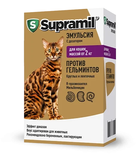 Супрамил эмульсия - антигельминтная эмульсия широкого спектра действия для котят и кошек, предназначенная для лечения и профилактики заражения круглыми и ленточными гельминтами, а также дирофиляриоза.