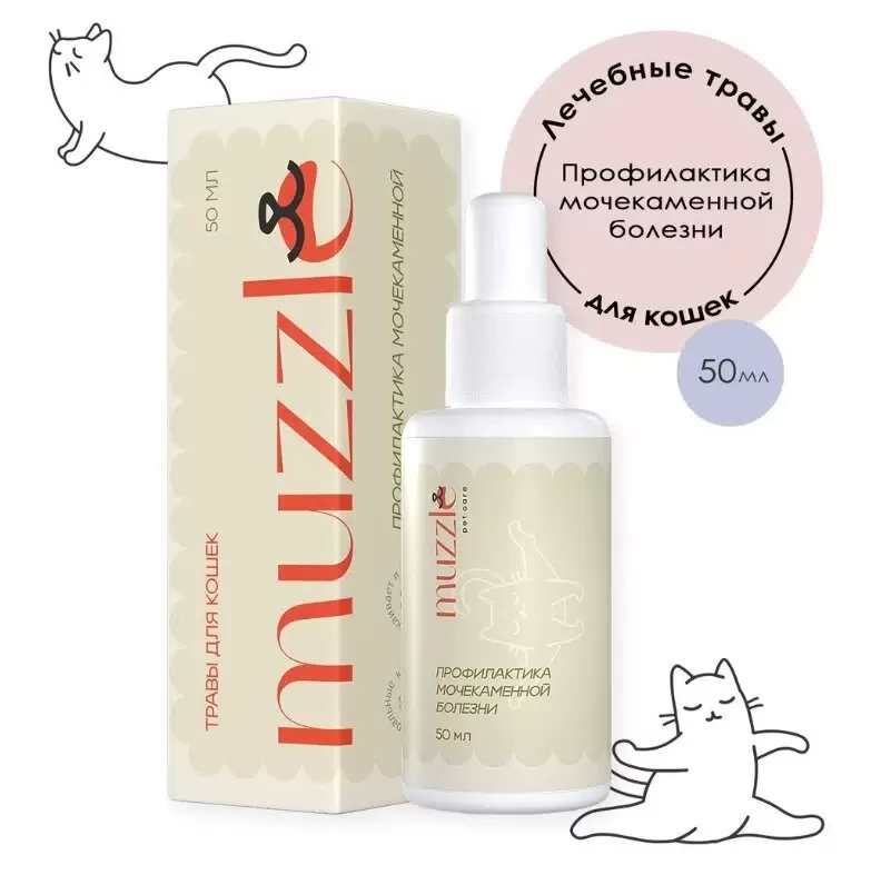 Капли для кошек для профилактики мочекаменной болезни. Профилактическое средство с мочегонным и противовоспалительным эффектом Muzzle (Маззл), противостоит образованию камней и песка в почках, обладает антибактериальным, успокаивающим действием и очищающим, детокс-эффектом. Нормализует водно-солевой баланс организма, оказывает мягкий мочегонный эффект.