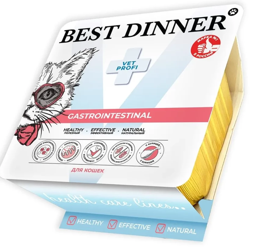 Влажный диетический полнорационный консервированный корм для собак при нарушениях пищеварения, всасывания в кишечнике и экзокринной недостаточности поджелудочной железы. Применяется при кишечных расстройствах, нарушениях пищеварения, экзокринной недостаточности поджелудочной железы, гиперлипедимии, лимфангиэктазии и гастрите. Продолжительность применения до 12 недель и в течении всей жизни в случае хронического заболевания ЖКТ. Рекомендуется проконсультироваться с ветеринарным врачом об употреблении или о продлении периода использования данного корма. Состав Мясо и субпродукты (курица), картофель, витаминно-минеральный комплекс, лососевое масло, пивные дрожжи, FOS, MOS, таурин. Аналитиеский состав "Массовая доля влаги – 80 %, Массовая доля белка - 10%, Массовая доля жира - 5,5%, Массовая доля клетчатки – 0,5%, Массовая доля золы – 2,5%, Массовая доля кальция – 0,3 %, Массовая доля фосфора – 0,25%, Массовая доля магния – %, Массовая доля натрия – 0,25%, Массовая доля калия– 0,3%, Омега-3 – %, Омега — 6 — %, Добавки на кг "Массовая доля цинка - 25 мг, Массовая доля меди - 1 мг, Массовая доля йода - 0,75 мг, Массовая доля марганца - 1,4 мг, Витамин А – 6600 МЕ, Витамин D - 200 МЕ, Витамин Е - 20 мг, Витамины В1 — 10 мг, Витамины В2 — 6 мг, Витамины В6 - 2 мг, Витамины В12 - 75 мкг, Витамины В3 - 15 мг, Витамины В5 - 9 мг, Фолиевая кислота - 0,35 мг, Биотин – 300 мкг, Хлорид холина - 1200 мг, Таурин - 1500 мг Энергитическая ценность 92 ккал/100 г Рекомендации по кормлению 45 - 65 г корма на 1 кг веса тела