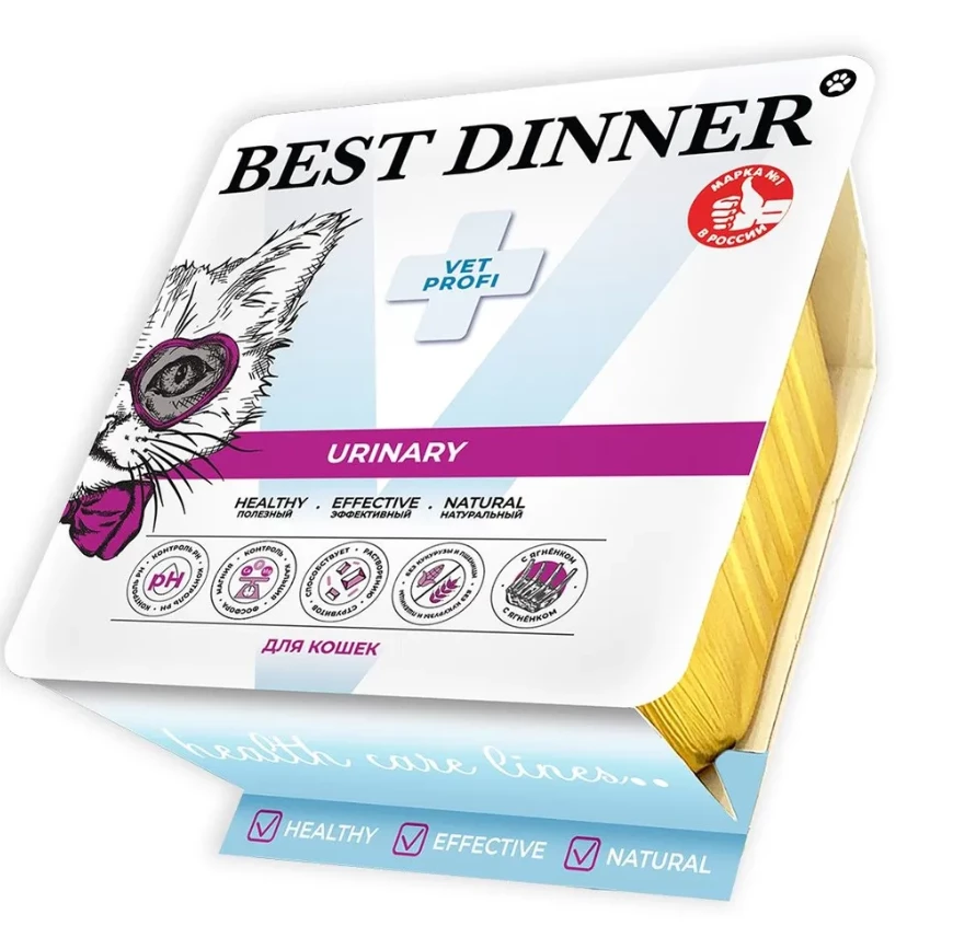 Влажный корм Best Dinner Vet Profi Urinary для любых кошек , нежный паштет с ягнёнком, профилактика и лечение МКБ Мясо и субпродукты (ягнёнок, курица), бульон, картофель, картофельный крахмал, клюква, витаминно-минеральный комплекс, лососевое масло, таурин. Массовая доля влаги –80 %, Массовая доля белка - 11%, Массовая доля жира - 5%, Массовая доля клетчатки – 0,25%, Массовая доля золы – 2,5%, Массовая доля кальция – 0,25%, Массовая доля фосфора – 0,2%, Массовая доля магния – 0,05%, Массовая доля натрия – 0,2%, Массовая доля калия– 0,25%, Массовая доля хлора– 0,3%, Омега-3 – %, Омега — 6 — %, Массовая доля цинка - 25 мг, Массовая доля меди - 1 мг, Массовая доля йода - 0,75 мг, Массовая доля марганца - 1,4 мг, Витамин А – 4300 МЕ, Витамин D - 200 МЕ, Витамин Е - 20 мг, Витамины В1 — 10 мг, Витамины В2 — 6 мг, Витамины В6 - 2 мг, Витамины В12 - 75 мкг, Витамины В3 - 15 мг, Витамины В5 - 9 мг, Фолиевая кислота - 0,35 мг, Биотин – 300 мкг, Хлорид холина - 1200 мг, DL-метионин - 4000 мг, Таурин - 1500 мг