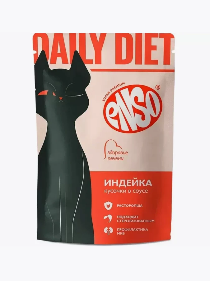 ENSO DAILY DIET Полнорационный влажный профилактический корм для взрослых кошек для поддержания здоровья печени, кусочки с индейкой в соусе. ENSO DAILY DIET — функциональные профилактические влажные рационы класса холистик для ежедневного поддержания здоровья кошек без курицы, сои, пшеничного глютена и ГМО. Каждый рацион линейки обогащен БИОАКТИВНЫМ комплексом добавок ENSO DAILY DIET, необходимых организму домашней кошки: • Масло льняное, подсолнечное, рыбий жир – источники жирных кислот Омега-3, 6, благотворно влияющие на состояние кожи и шерсти • Биотин – витамин В7, недостаток которого провоцирует усиленную линьку • Клюква – богата антиоксидантами, обладает противовоспалительным действием • DL-метионин – аминокислота, подкисляющая мочу • Инулин – пребиотик, стимулирует работу ЖКТ • Экстракт эхинацеи –– растительный иммуномодулятор • Экстракт юкки шидигера – снижает запах продуктов жизнедеятельности питомца • L-карнитин – источник энергии, способствует поддержанию метаболизма жиров и оптимального веса, благотворно влияет на сердце Содержит волокна подорожника – источник растворимой клетчатки, способствующей выводу шерстяных комочков естественным путем. Состав Мясо и субпродукты не менее 43% (индейка не менее 12%), рис, витамины и минералы, масло подсолнечное, масло льняное, волокна подорожника, рыбий жир, расторопша, DL-метионин, инулин, клюква, экстракт юкки Шидигера, таурин, экстракт эхинацеи, L-карнитин, биотин Анализ: Влажность - 82%, Белки - 9,2%, Жиры - 4%, Углеводы - 2,8%, Зола - 1,4%, Клетчатка - 0,5%. Добавки на 1 кг: Кальций - 200 мг, Натрий - 200мг, Калий - 200мг, Фосфор - 180мг, Таурин - 90мг, Магний - 15мг, Железо - 10мг, Цинк - 3мг, Марганец - 0,5мг, Медь - 0,25мг, Витамин А -300 МЕ, Витамин D3 - 30 МЕ, Витамин Е - 3 МЕ. Энергетическая ценность 83 Ккал