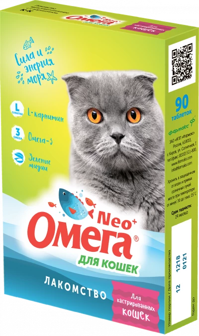 Омега Neo+ — вкусное и полезное лакомство для поощрения, баловства и поддержания здоровья кастрированных кошек