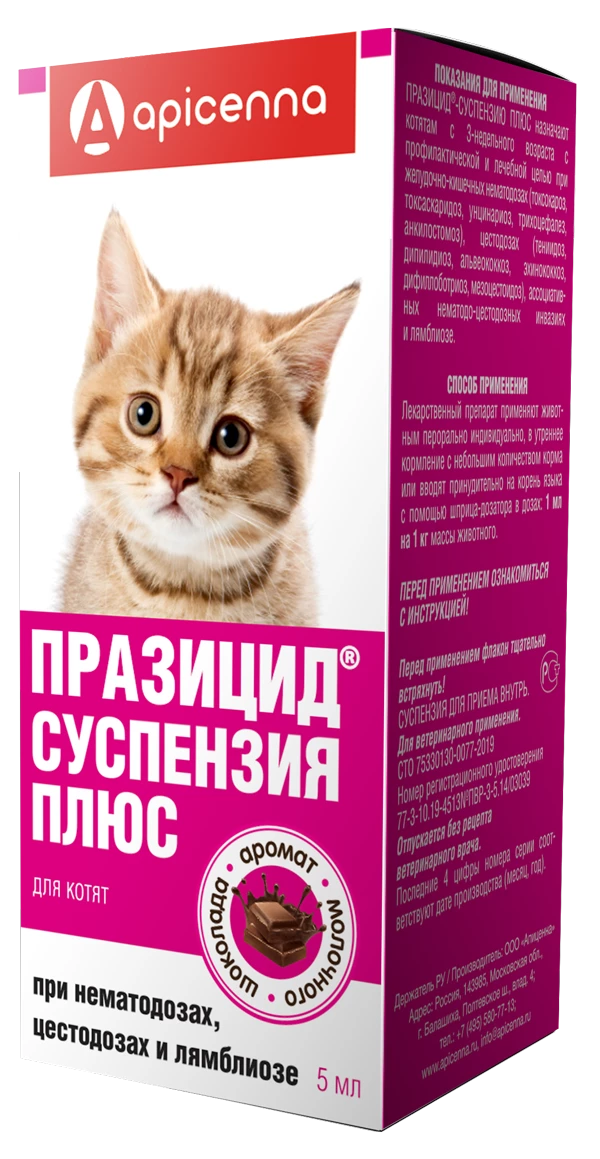 Празицид-Суспензию Плюс назначают взрослым собакам и кошкам, щенкам и котятам с 3-недельного возраста с профилактической и лечебной целью при желудочно-кишечных нематодозах (токсокароз, токсаскаридоз, унцинариоз, трихоцефалез, анкилостомоз), цестодозах (тениидоз, дипилидиоз, эхинококкоз, дифиллоботриоз, мезоцестоидоз) и смешанных нематодо-цестодозных инвазиях.