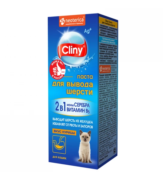Паста для вывода шерсти Cliny способствует естественному выведению комков шерсти (безоаров) из желудка животных. Избавляет кошек от рвоты, потери аппетита, закупорки кишечника, запоров. Обладает привлекательным для кошек вкусом курицы.